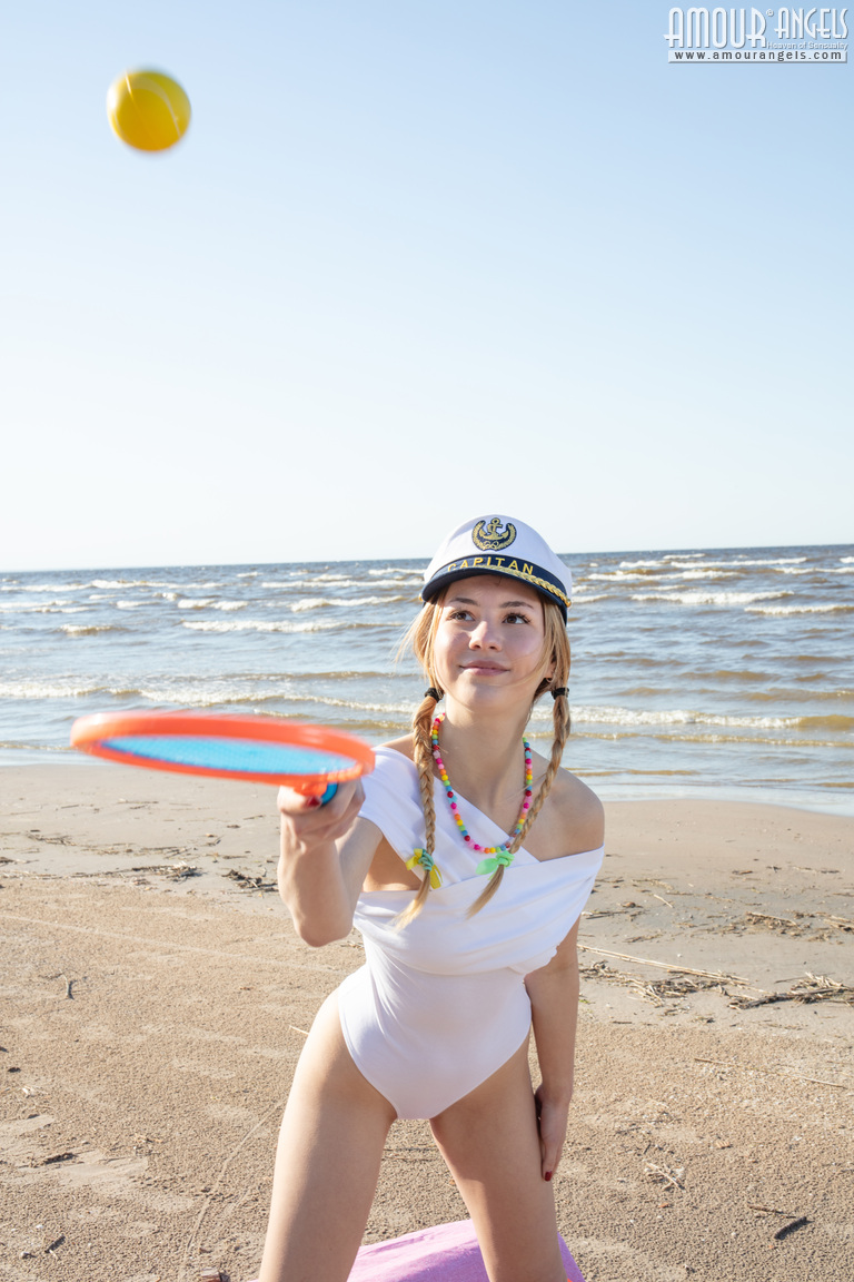 Cute shaved sailor with big tits nude at the beach from