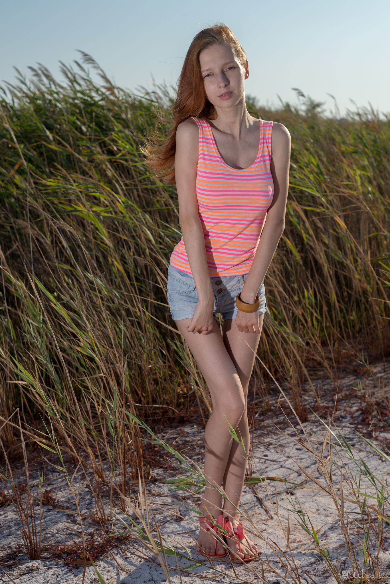Petite redhead with perfect firm tits and hard nipples in a field from