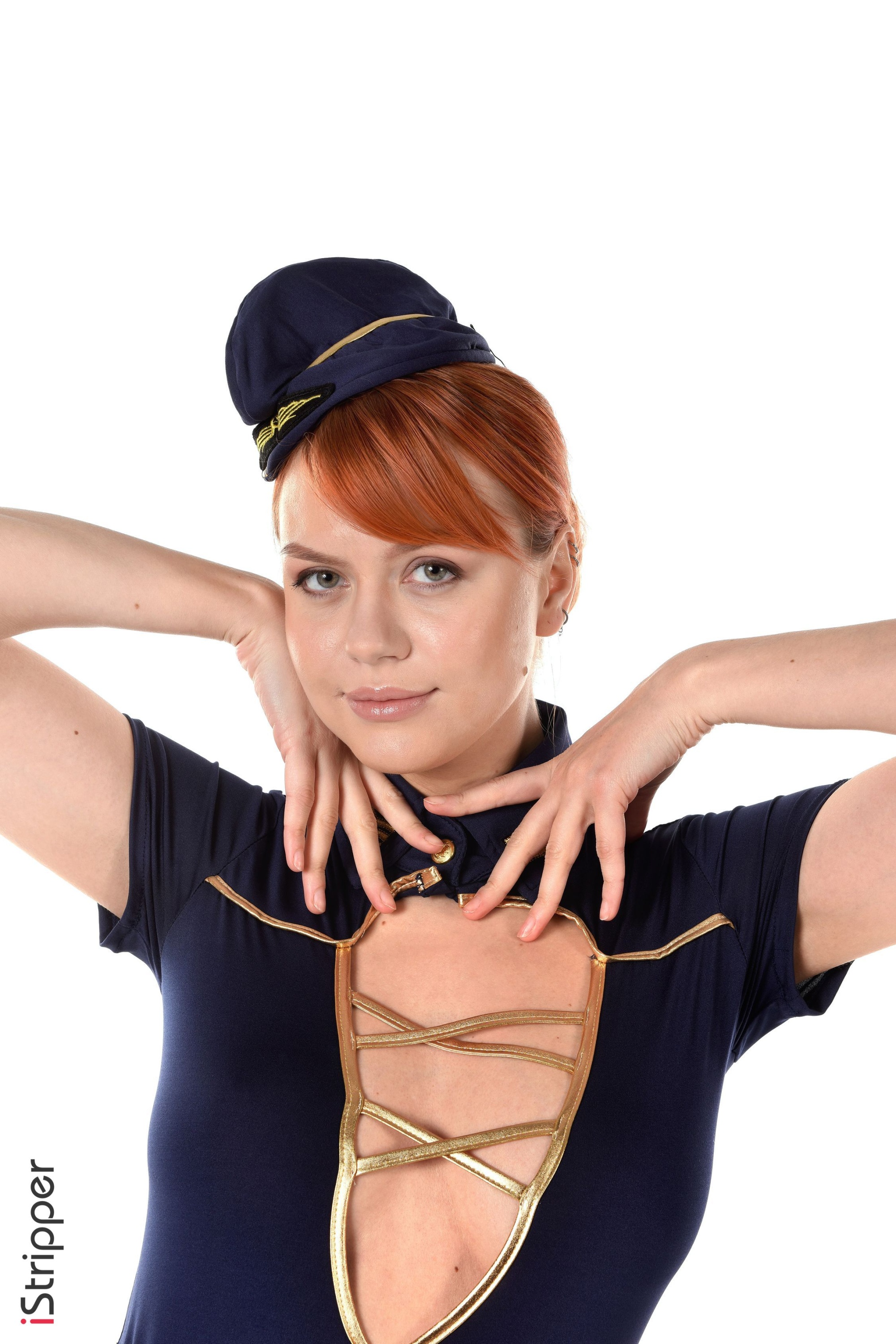 Busty redhead flight attendant stripping from