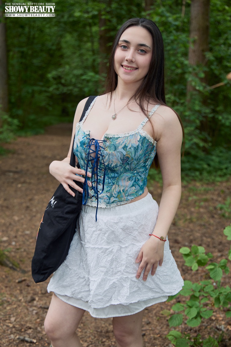 Chubby brunette exposes her big tits and saucer nipples in a forest from